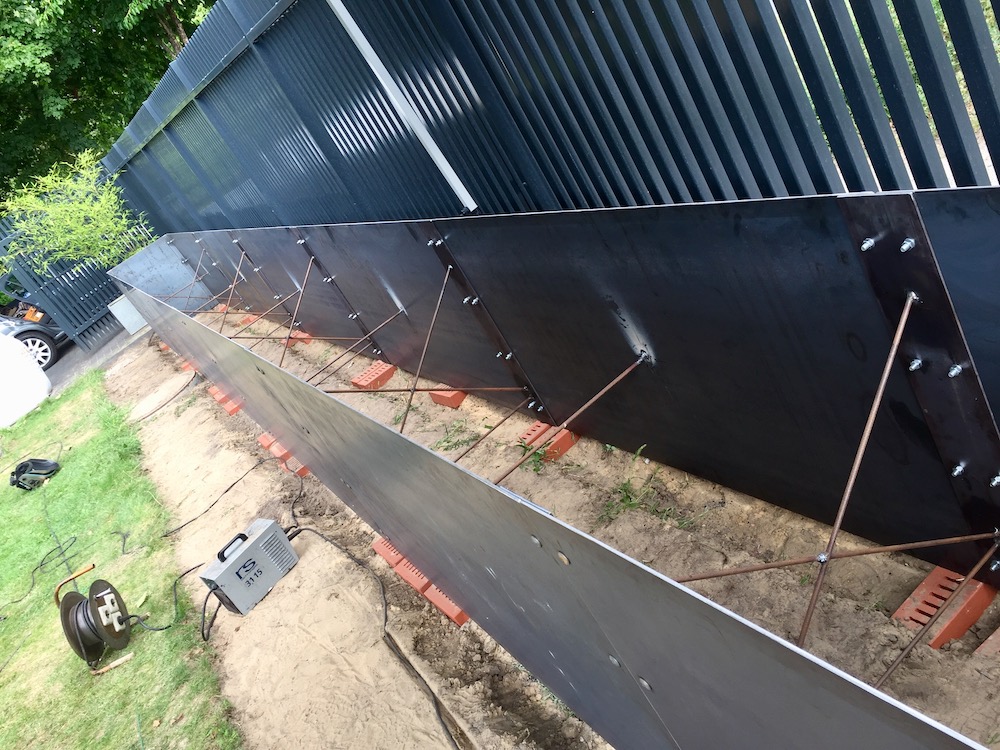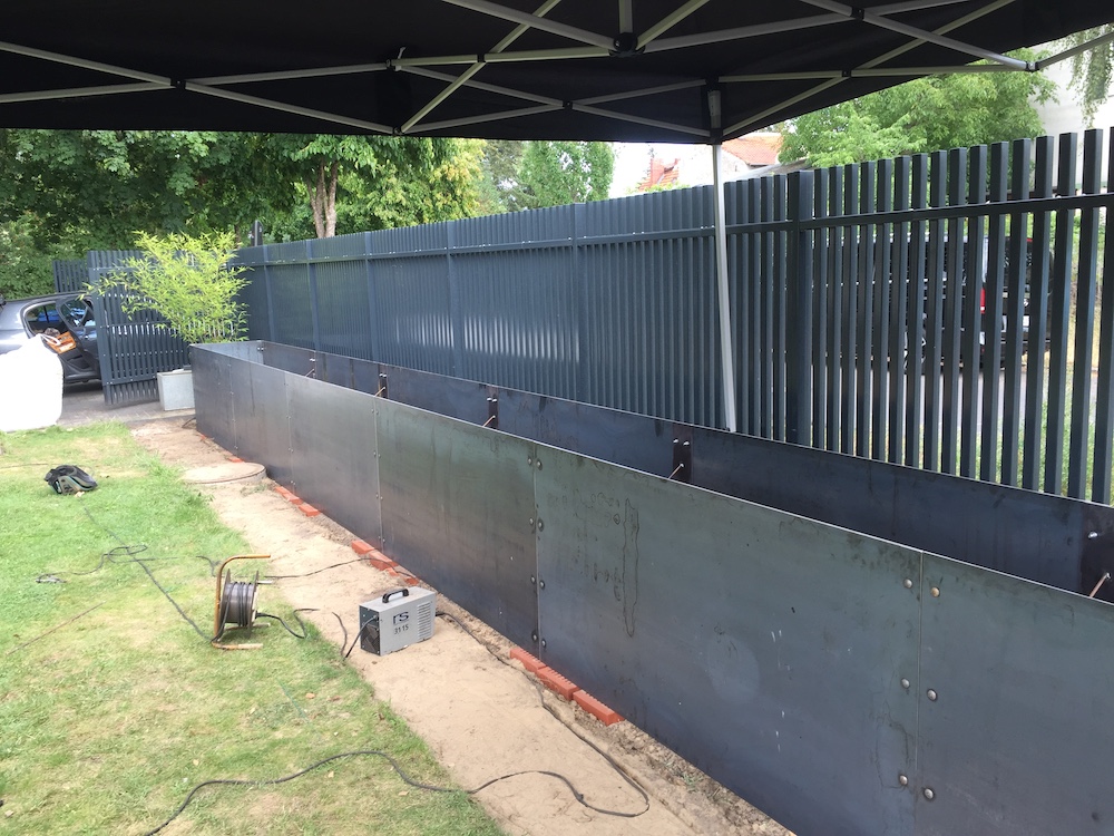 Dieses Jahr durfte ich noch ein zweites Hochbeet herstellen, mit einer gigantischen Länge von 13 Metern! Es ist aus Stahlblech mit Walzhaut gefertigt und hat eine Tiefe von 80 cm und eine Höhe von 100 cm. Mit Bambus bepflanzt dient es nicht nur als grüner Sichtschutz sondern verringert auch den Strassenlärm beträchtlich.
