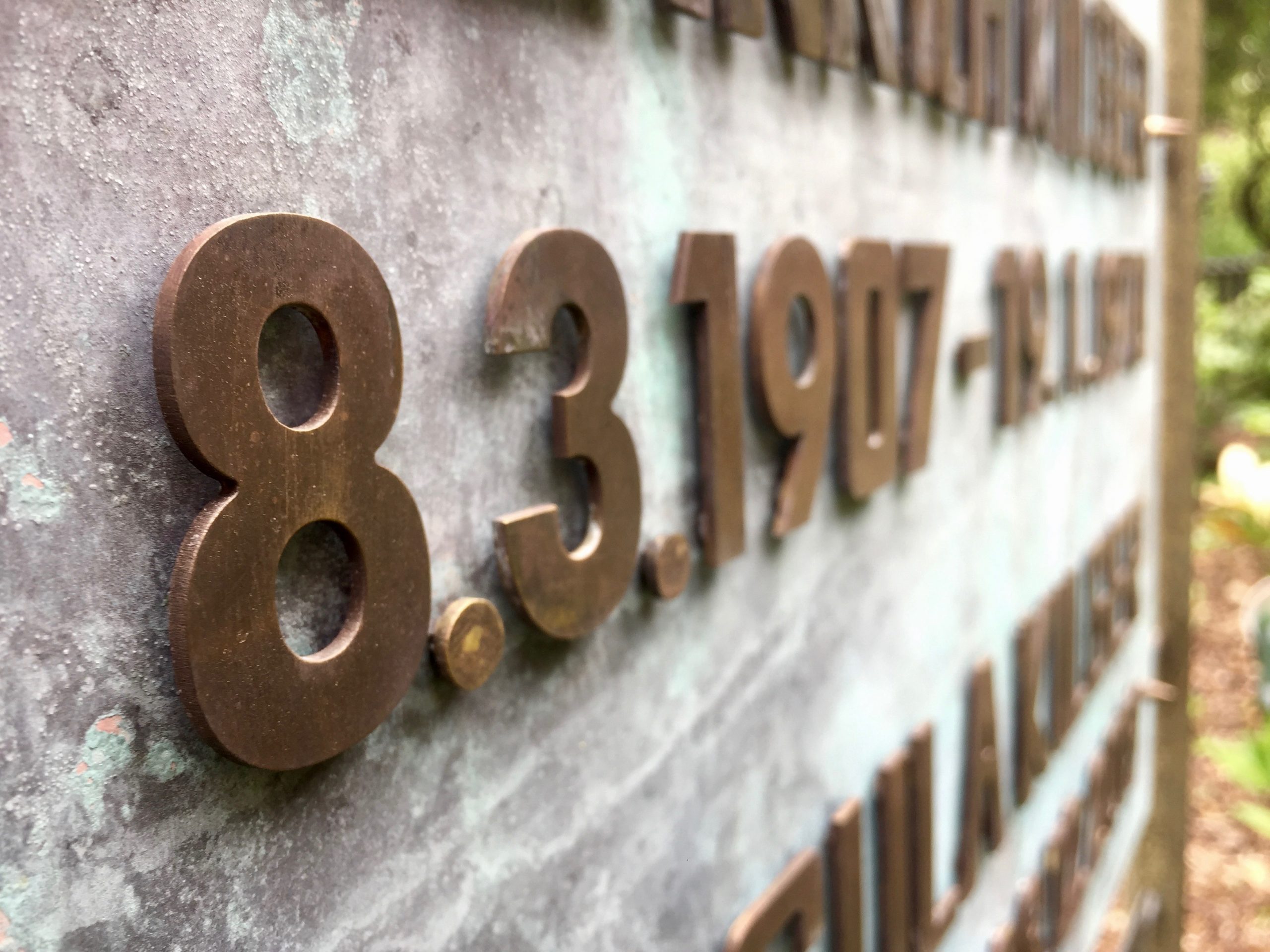 Eigentlich wollten ich die Grabtafel nur sanieren und um einen Schriftzug erweitern. Aber nun habe ich sie doch komplett neu gebaut und den verwitterten Zustand optisch wieder hergestellt. Die Platte ist aus brüniertem Messing und die Messingbuchstaben wurden in der Schriftart der Originalschrift angepasst.